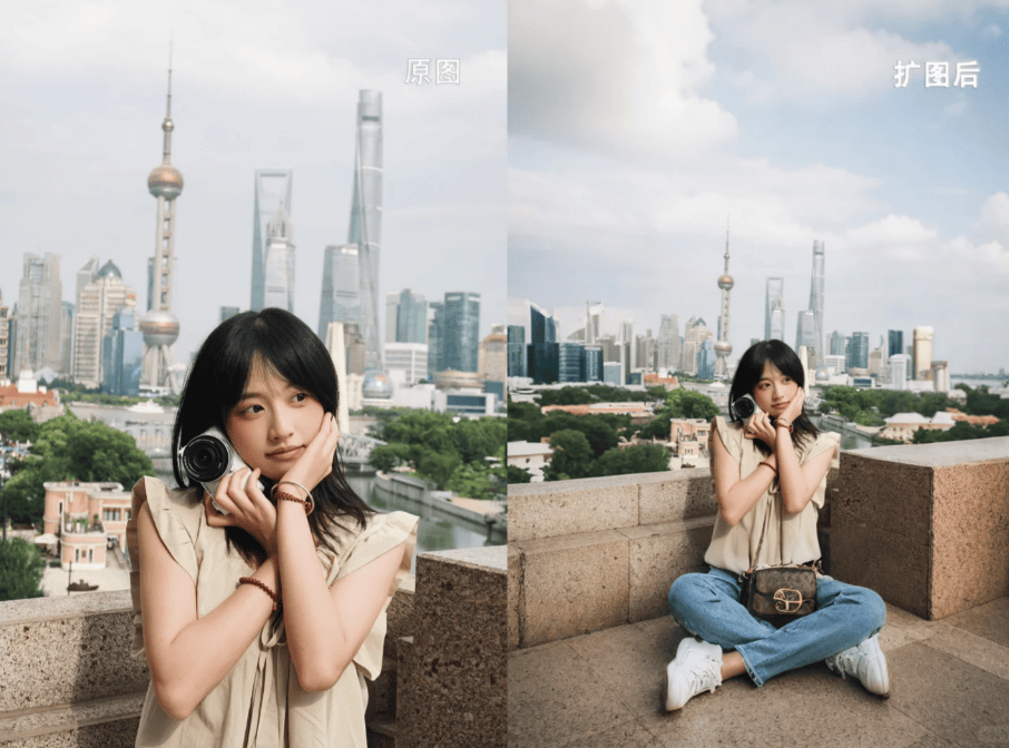 我妈看我用这个功能,几个功能刚好戳中旅逛照的痛点,本人的废片只能存相册,会留下恍惚的印子,完全不假。用搜狐简单 AI 的“图像美化-扩展图片“!